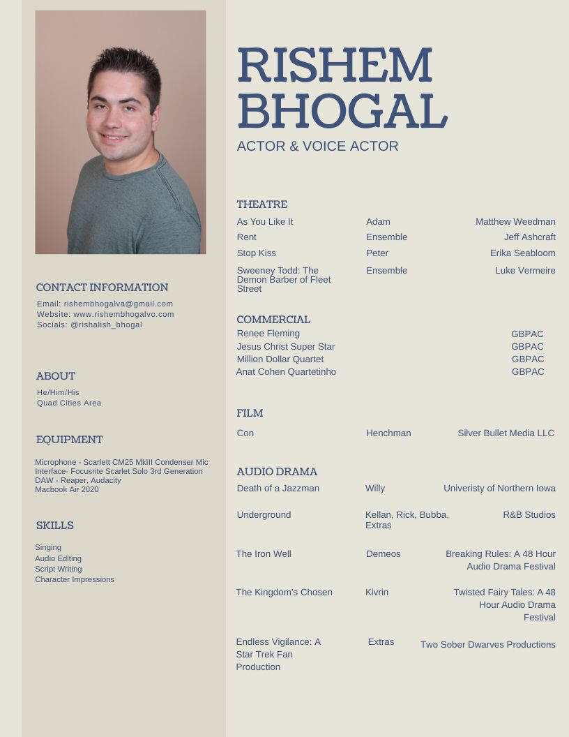 Rishem Bhogal is an actor from Bettendorf, Iowa. He started his acting journey in 2019 at the University of Northern Iowa and graduated with a BA in Theatre Performance. He has experience in stage performance, being involved in plays and musicals in the local Quad Cities area and at UNI. He also has experience in voice work, being involved in a radio play, multiple audio dramas, and the voice of four local commercials for Gallagher Bluedorn Performing Arts Center at UNI.He is active on social media, part of the voice acting communities on TikTok, Instagram, and Bluesky where he does impressions and fandub collaborations with other voice actors.He is currently involved a passion project called Underground, an action-packed crime audio drama that he is producing himself. More information is found under the Underground button above.